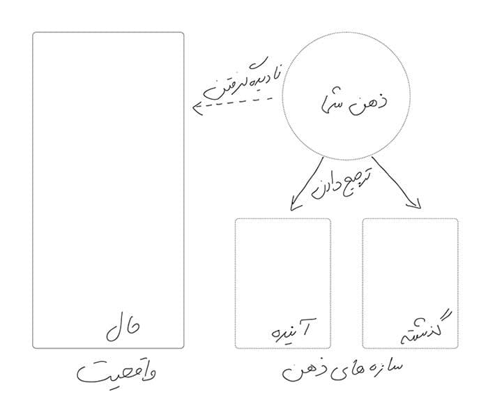 نکته مهمی که باید بدانیم این است که ذهن ما برای ایجاد حس ما نسبت به خودمان و واقعیت، متکی به گذشته و آینده است. به نظر میرسد که بدون وجود این دورههای زمانی برای فکر کردن، ذهن هدف و عملکرد خود را از دست میدهد. پس در سطح پایه، ذهن سعی میکند ما را با دورههای دیگر غیر از زمان حال، مشغول نگه دارد.